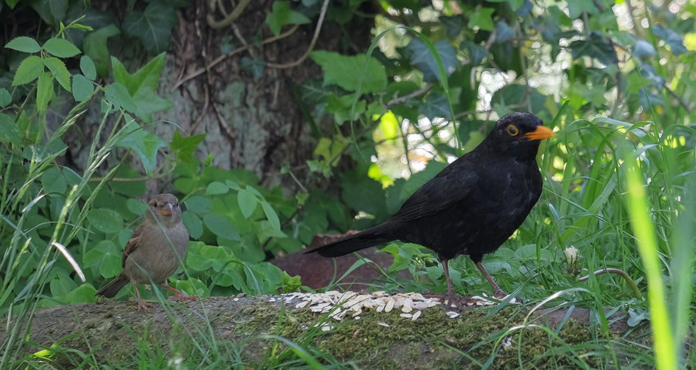 Junge Hausspatzendame und Amsel-Mann an den Haferflocken...