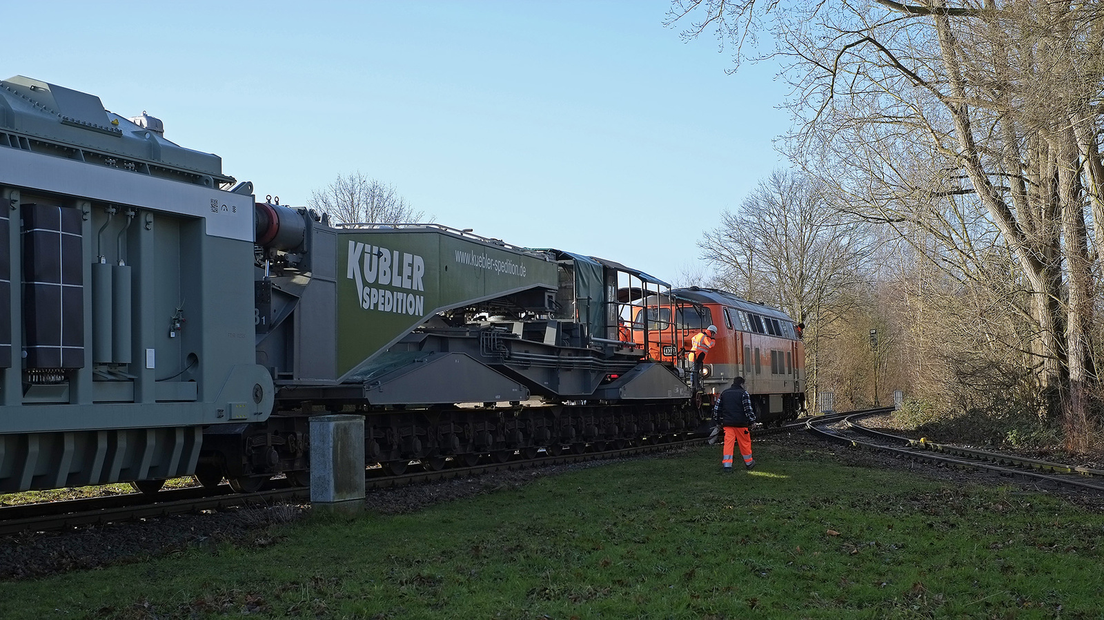 Trafo-Schwertransport fährt in Ausziehgleis zum Umspannwerk