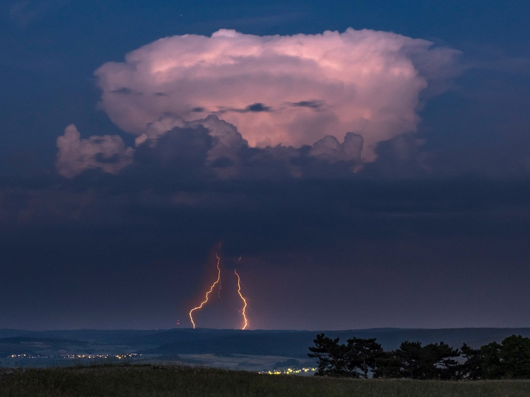 Vor einem Monat. Es war drückend warm. Im Westen des Nördlinger Ries gab es einen sehenswerten Sonnenuntergang während im Südosten heftige Gewitter tobten. Ich stieg bei letztem Licht auf meinen Hausberg den Ipf (mit Hocker). Gegen 23:20 startete ich eine Belichtungsserie mit Intervalltimer. Blick Richtung Südosten. Stativ, X-T4, 35mm bei , f 11, ISO 800, Intervalle mit 25sec. und jeweils 30 sec. Pause. Insgesamt ließ ich die Kamera 30 Minuten mit externer Stromversorgung laufen. Beiliegendes Bild entstand in der Serie um ca. 23.3354 points