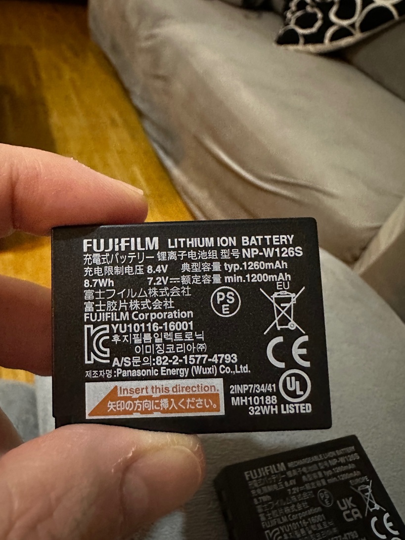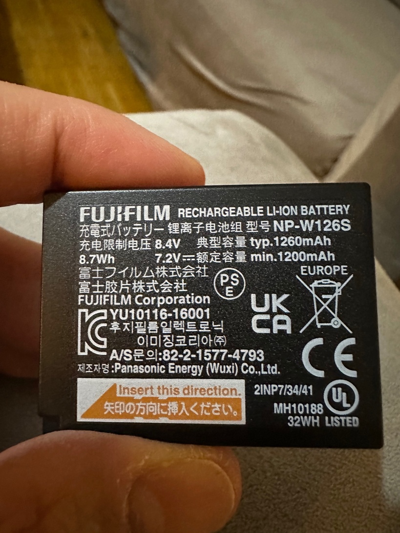 I just bought from Amazon.de a new NP-W126S for my X100V and the writing on the battery is not the usual “LITHIUM ION BATTERY”but instead it says “RECHARGEABLE LI-ON BATTERY”. Also, it has an UK/CA printed icon that the original battery that came with my camera doesn’t have.