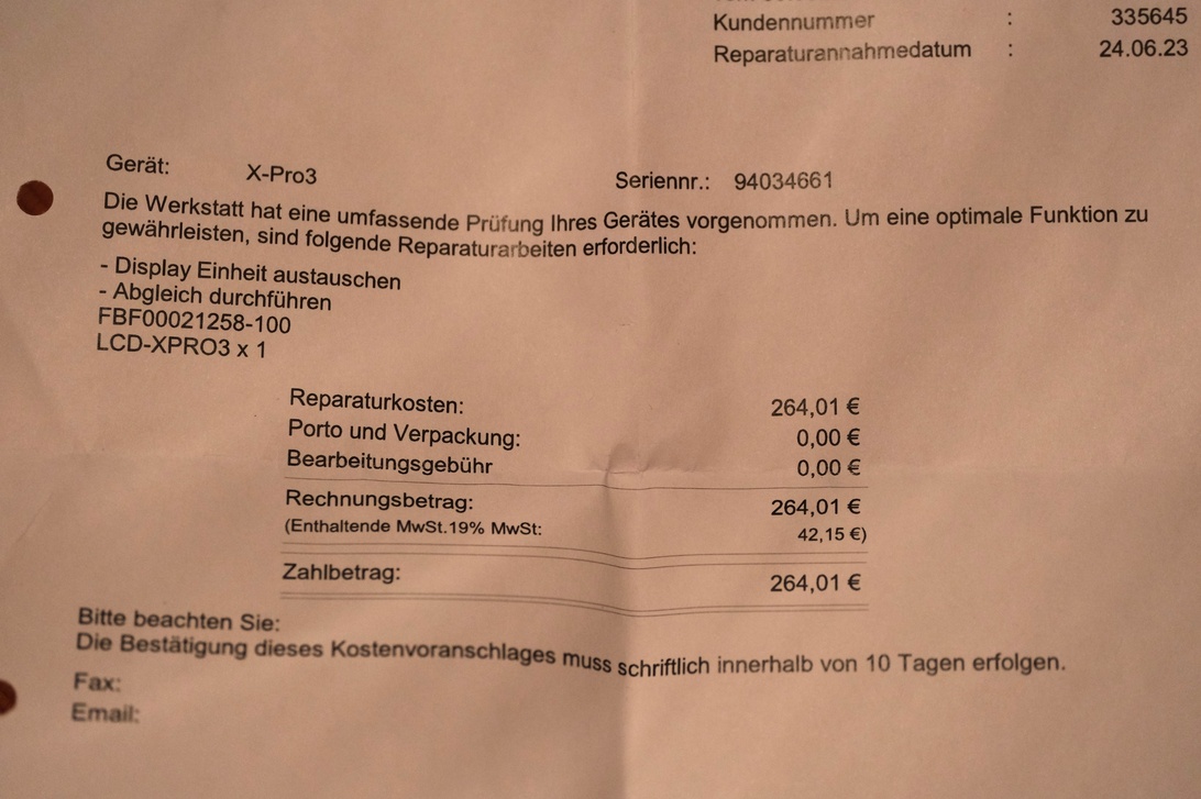 jazzlampe Geschrieben 26. März Share #115 Geschrieben 26. März Heute kam der Kostensvoranschlag: Freundliche 96€.👍 Ich möchte generell mal ein großes Lob zum Fuji-Service aussprechen: Ich hatte in den letzten 7 Jahren drei Reparaturen. Keine hat inkl. Rückversand länger als 10 Tage gedauert. Keine war übertrieben teuer. Die Kommunikation war immer 1A. Beim Tausch des Einstellrades an meiner X-Pro1 ist durch die Reparatur ein weiteres Problem entstanden. Dieses wurde kostenlos und sehr schnell gelöst. Das nenne ich alles sehr vernünftg. Und jetzt freue ich mich ne Runde und warte auf meine X-Pro3. Wenn sie wieder ganz gesund ist, darf sie im Mai einen Monat lang mit nach Cornwall🤩 yammat, bgrimm, Photoweg und 1 weiterer haben darauf reagiert 4 Link zum Beitrag Auf anderen Seiten teilen More sharing options...
